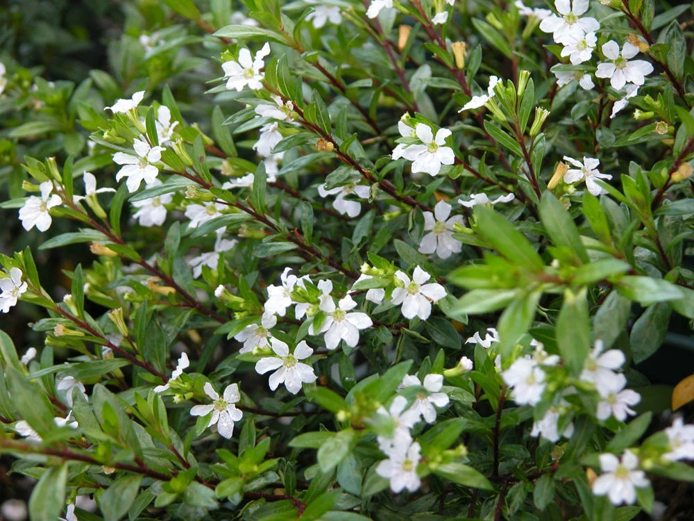 Cuphea hyssopifolia, the false heather, Mexican heather, Hawaiian heather or elfin herb, is a small evergreen shrub native to Mexico, Guatemala and Honduras. It grows to about 60 cm hight by 90 cm wide and has purple, lavender or white coloured flowers and fine foliage. They are best suitable for hanging basket, border plants, ground covering etc.. it can grow in either direct sunlight or semishade condition also. The Latin specific epithet hyssopifolia referring to the fine, narrow leaves of that plant. In colder regions it may be cultivated as an annual. Plants may be propagated by cuttings, layering or division. They seed freely, and new seedlings that appear are easily transplanted.